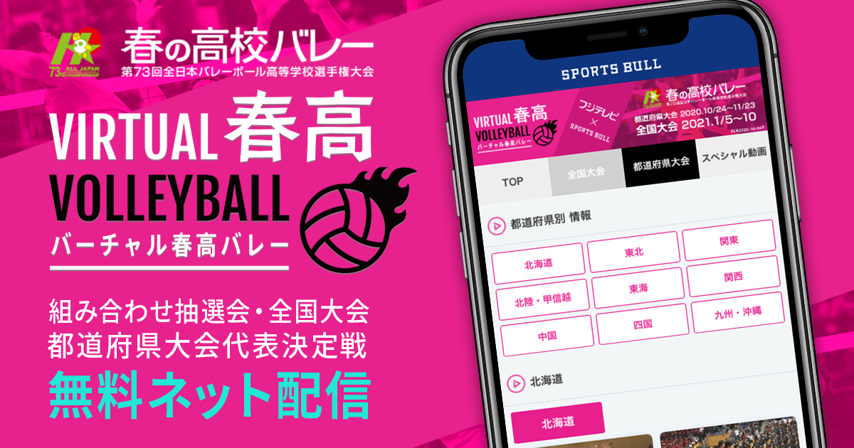 株式会社フジテレビジョン(以下、フジテレビ)と、株式会社運動通信社(以下、運動通信社)は、運動通信社が運営するスポーツメディア「SPORTS BULL(スポーツブル)」内の春の⾼校バレー総合情報サービス「バーチャル春⾼バレー」にて、第73回全⽇本バレーボール⾼等学校選⼿権⼤会(通称:春⾼バレー)を盛り上げるべく、10⽉24⽇より全国で⾏われる都道府県⼤会の代表決定戦全106試合を、無料でライブ配信すると発表した。