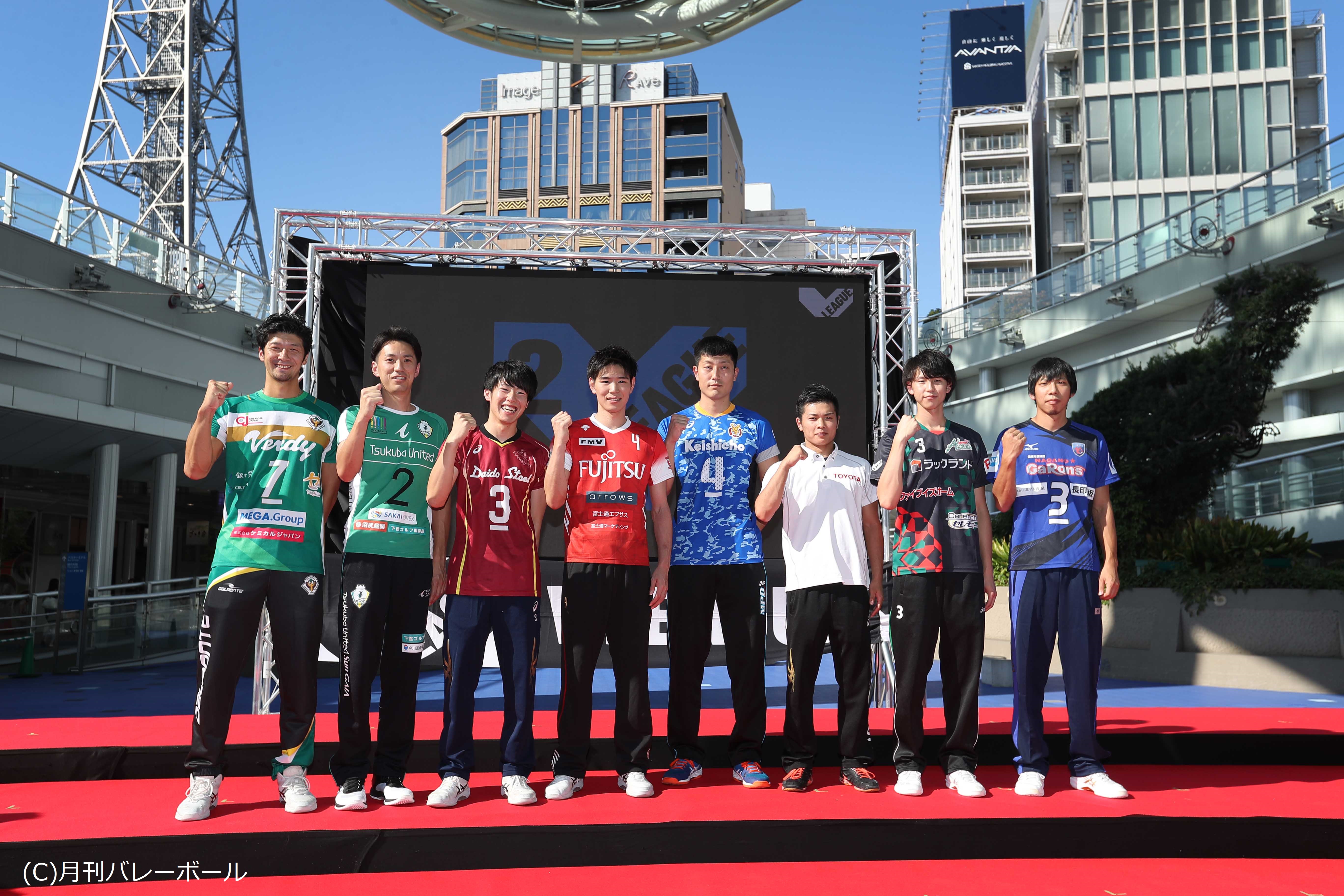 いよいよ始まる新リーグ開幕に先だち、『2018-19V.LEAGUE男子大会開幕プロモーションイベントおよび記者会見』が10月9日に名古屋市オアシス21 で行われた。V1、V2 の男子全18チーム(※この日、V2のきんでんはチーム事情により欠席)の監督と選手が一堂に会し、今シーズンへの熱い思いを会場に詰め掛けたファンの前で明かした。