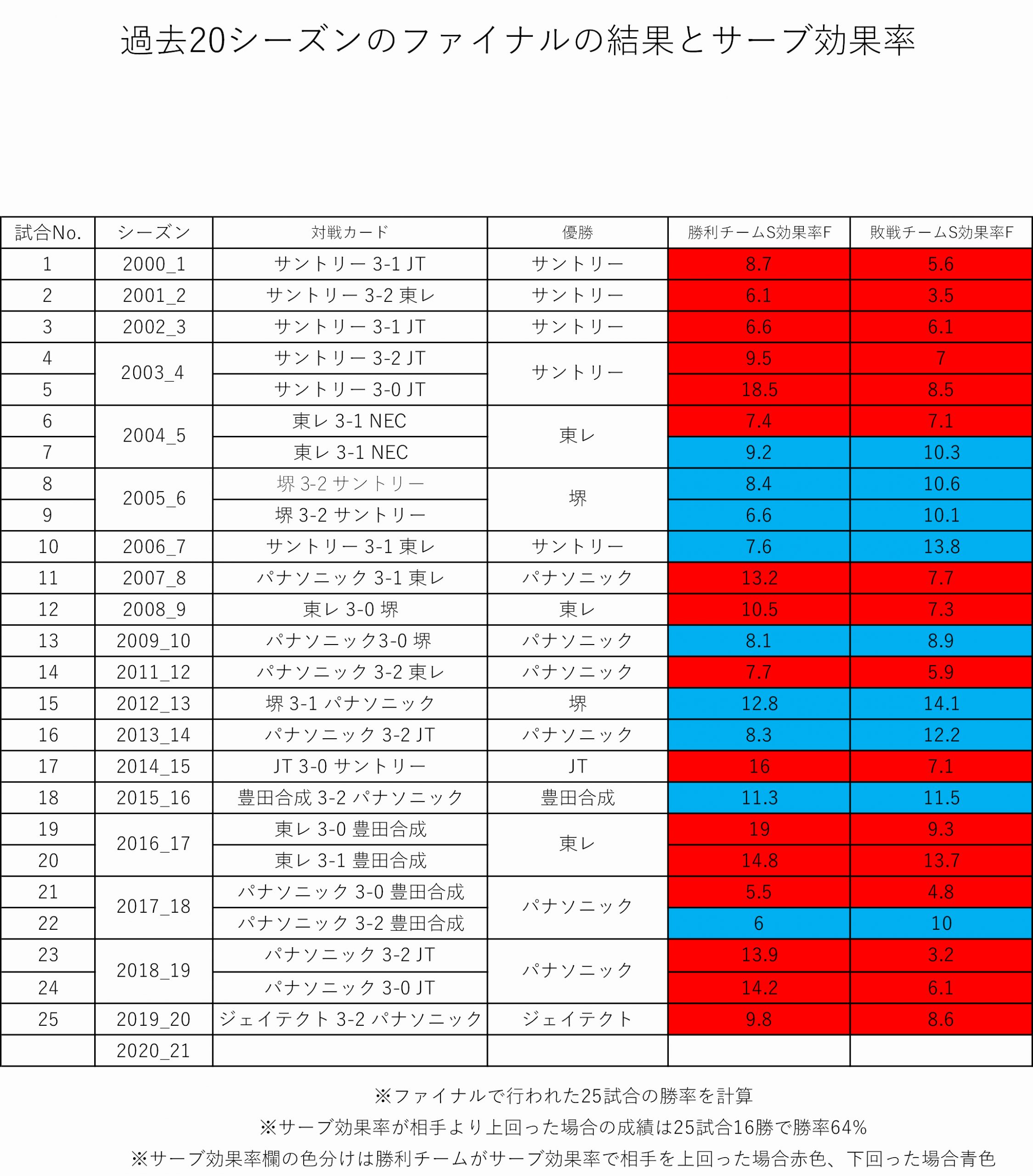 男子の試合において力強いサーブは見どころの一つだが、ファイナルでの試合においてサーブの効果率だけを見たときの勝率はどうなっているだろうか。下表は2000/01年の第7回Vリーグから昨シーズンまで、20年分のファイナルの結果を一覧にしたものだ。優勝の決定方式は1戦のみや2勝したチームの優勝、あるいはゴールデンセットの適用などシーズンによって違うため、“ファイナル”で行われた全試合を対象としている。この表の赤と青で色分けした項目に注目して欲しい。赤はファイナルの各試合において、勝利チームのサーブ効果率が相手より上回った試合、青はサーブ効果率が相手より下回った試合だ。