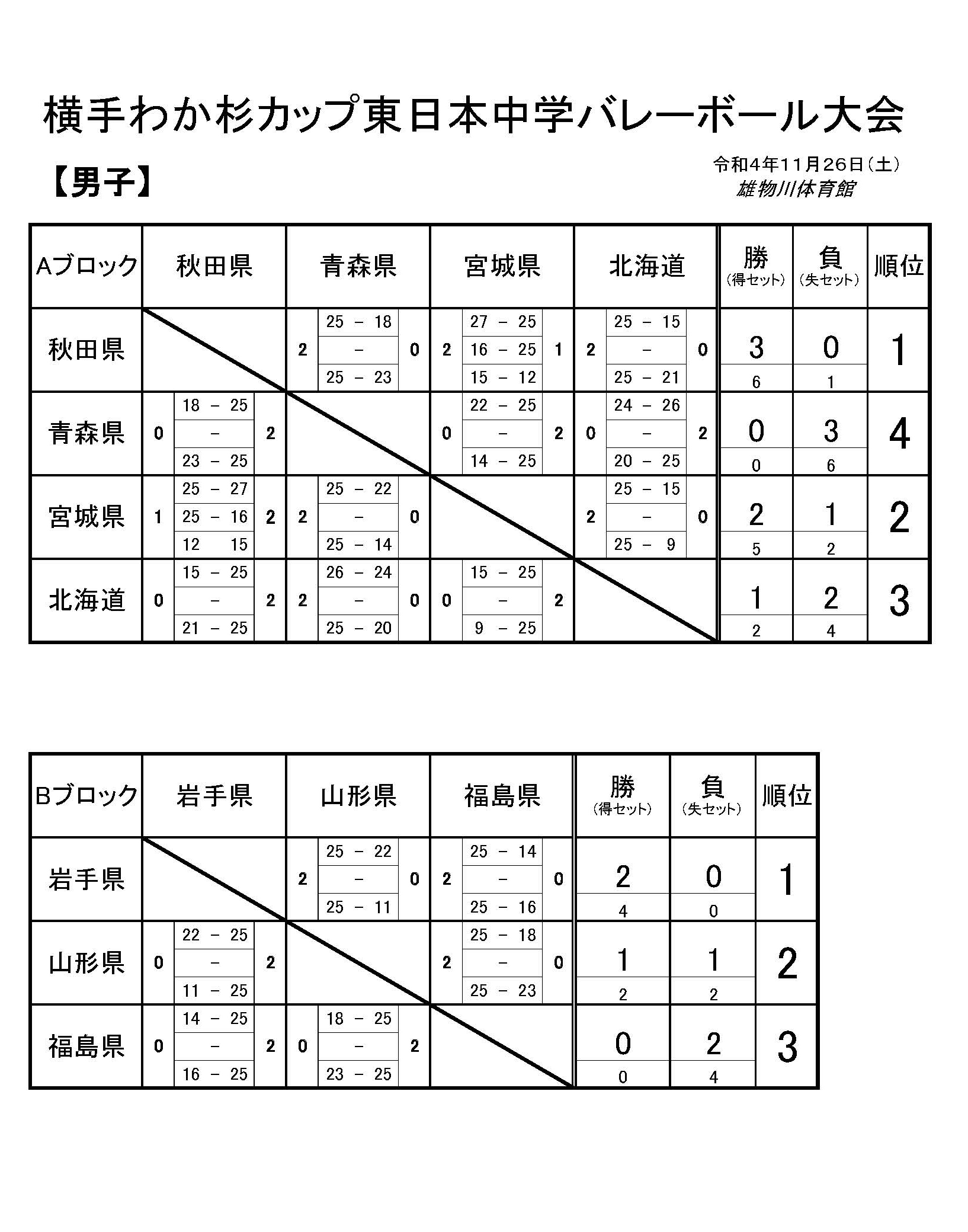 【結果一覧】横手わか杉カップ東日本中学大会男女予選リーグ戦表