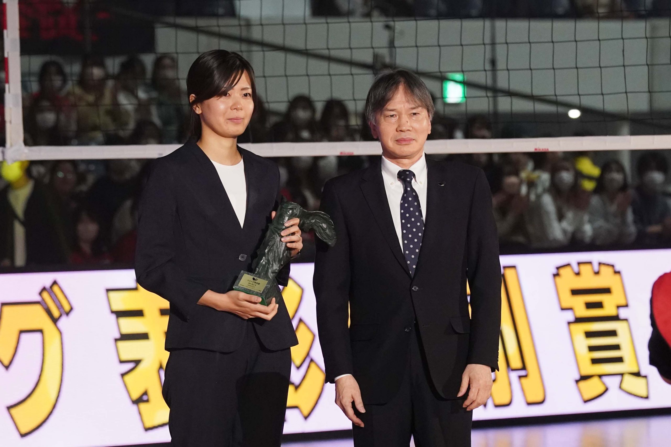 そして、7度のブロック賞を受賞し、通算ブロック決定本数の日本記録を打ち立てた富松崇彰さん(東レ)がVリーグ功労者表彰を受けた。昨シーズン限りで引退し、現在はサポートスタッフを務め、「改めてすごい賞をもらっているなと、実感しました。あれだけ跳んで、スパイクを打つことがどれほど体に悪いかを思い知らされました。痛いところが全部なくなりました」と笑顔。会場のファンへ、「日本の頂点が決まる戦いなので、サントリーサンバーズとウルフドッグス名古屋の技とパワーを楽しんで、最高の1日にしてください!」と呼びかけた。