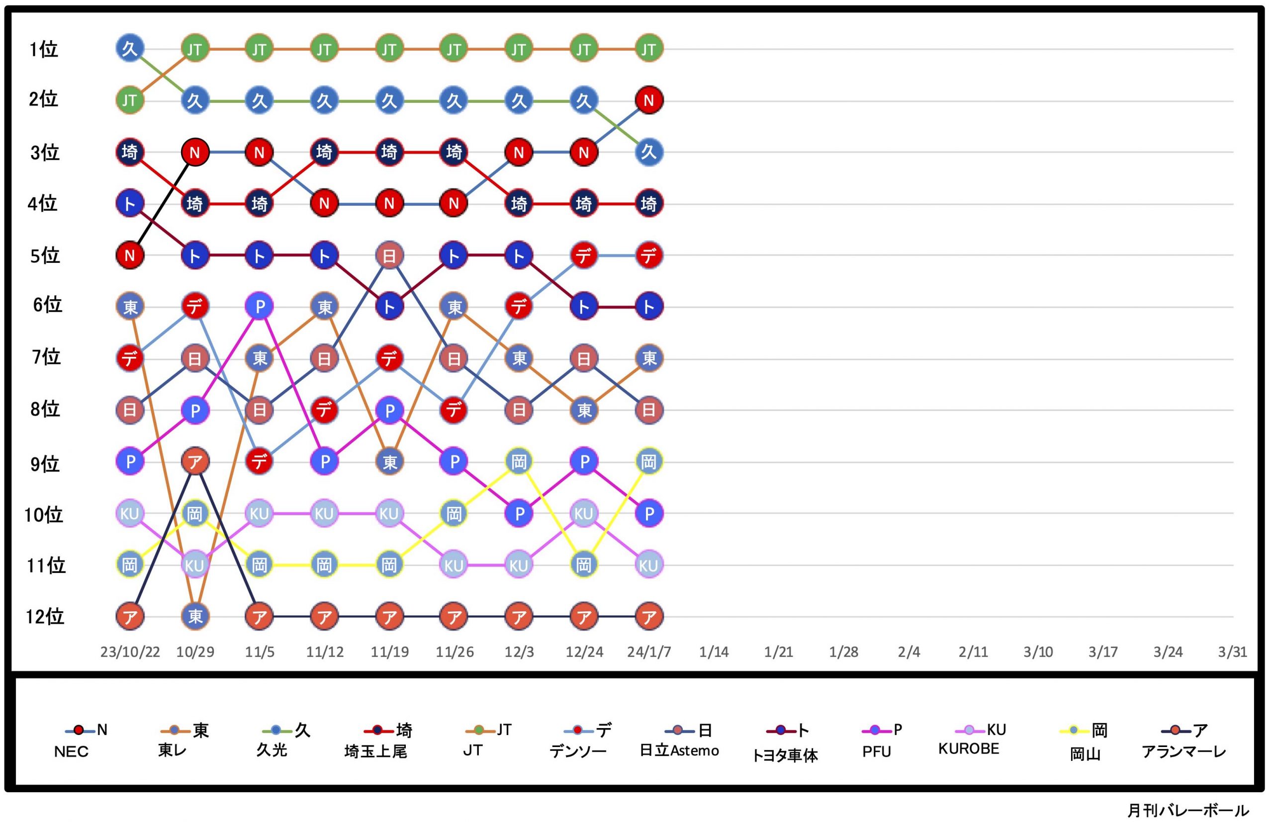 V1女子順位推移表(1月14日終了時点)