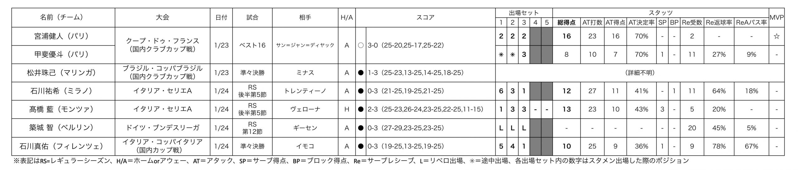 2023年度バレーボール男女日本代表で活躍し、クラブシーズンを海外リーグで戦う選手たちの活躍を振り返る。今回は1月23日(火)、24日(水)に行われた試合結果をお届けする。(日程はすべて現地)