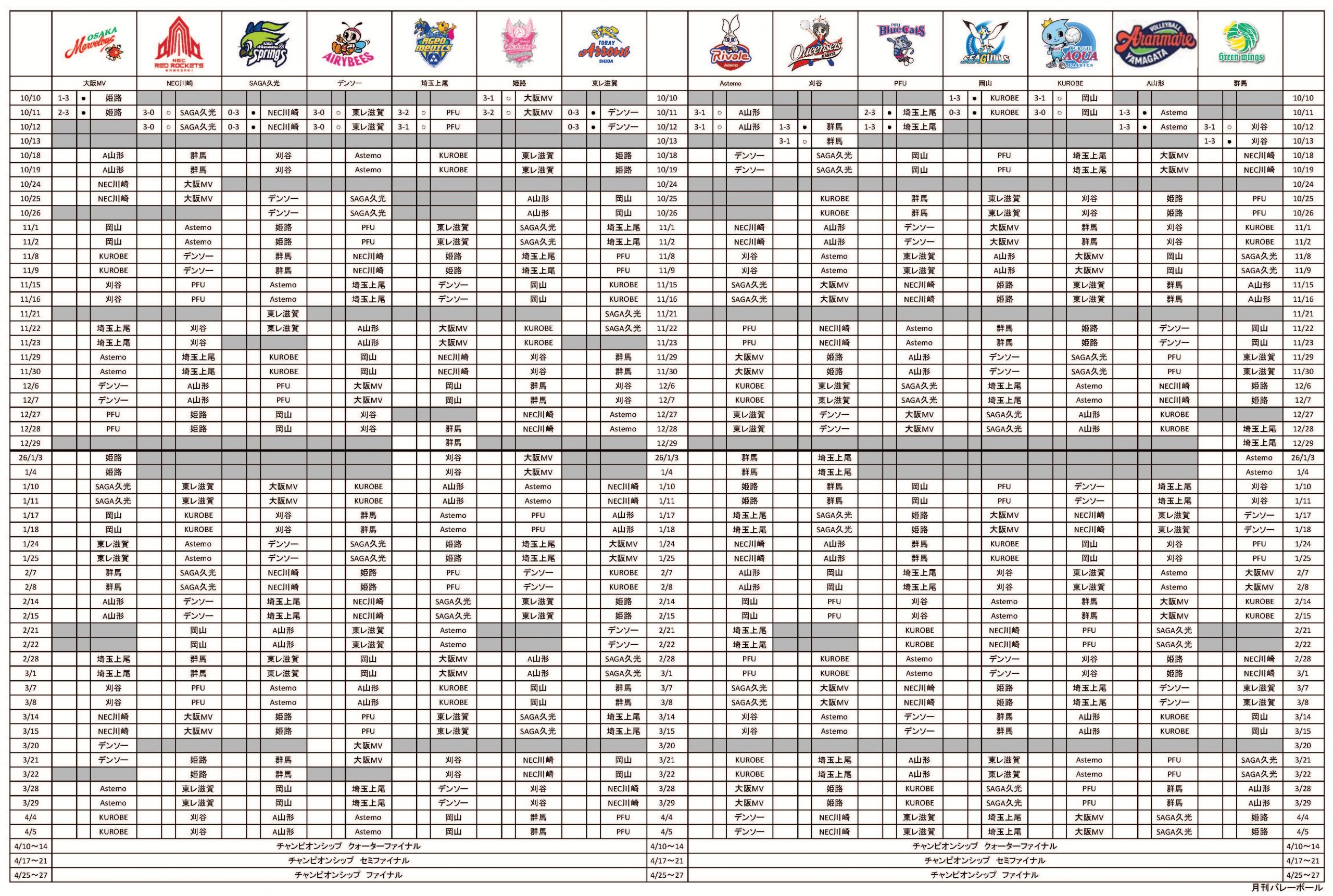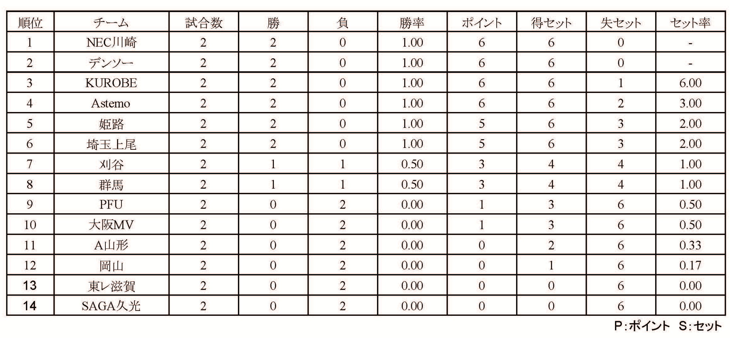 ヴィクトリーナ姫路はアウェーで昨季優勝の大阪マーヴェラスと対戦。カミーラ・ミンガルディ(20得点)と野中瑠衣(15得点)、いずれも新加入の両選手を中心に得点を重ね、初戦を制した。続く2戦目では互いにセットを取り合う展開となり、フルセットにもつれ込んだが、宮部藍梨が両チーム最多の28得点の活躍を見せ、昨年王者から連勝を飾った。昨季は最下位だった群馬グリーンウイングスはクインシーズ刈谷とアウェーで対戦。初戦はセットを先取をされたものの、オリビア・ロジャンスキ(21得点)を筆頭に4選手が2桁得点をあげ、逆転で開幕戦を制した。続く2戦目では勢いそのままにセットを先取したが、ソフィア・クズネツォワ(22得点)と鴫原ひなた(21得点)がともに20得点を超える活躍で攻撃をけん引した刈谷に逆転負けを喫し、1勝1敗で星を分け合った。そのほかにはKUROBEアクアフェアリーズ、埼玉上尾メディックス、デンソーエアリービーズ、Astemoリヴァーレ茨城、NECレッドロケッツ川崎がいずれも連勝を飾った。