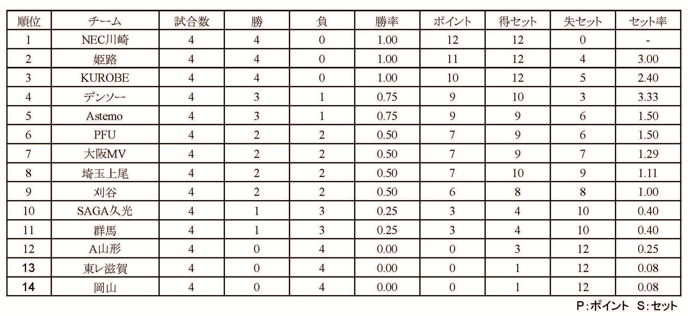 SV女子順位表(10月19日終了時点)
