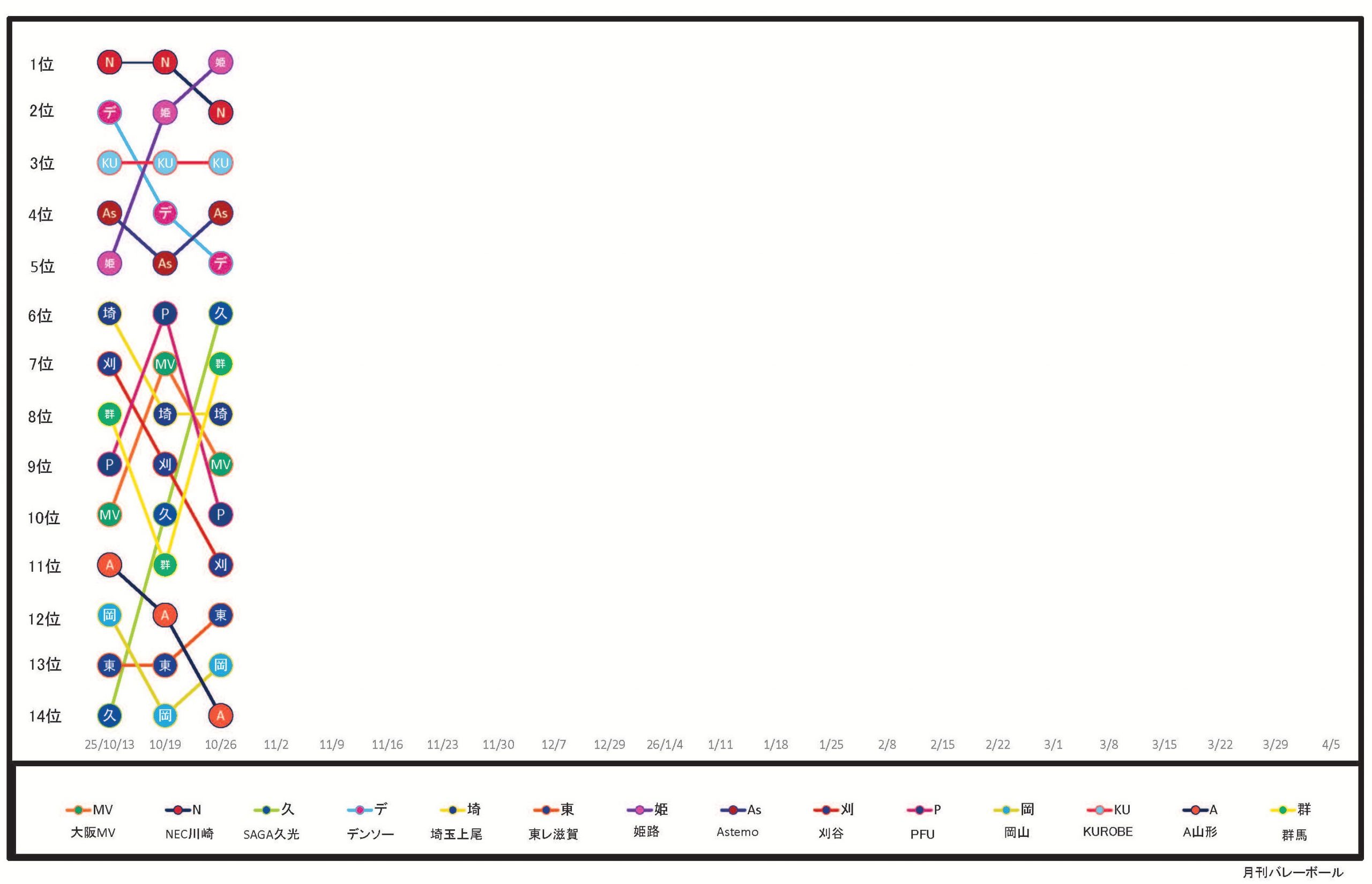 【図】連勝連敗がひと目で分かるSV女子結果一覧(10月26日終了時点)
