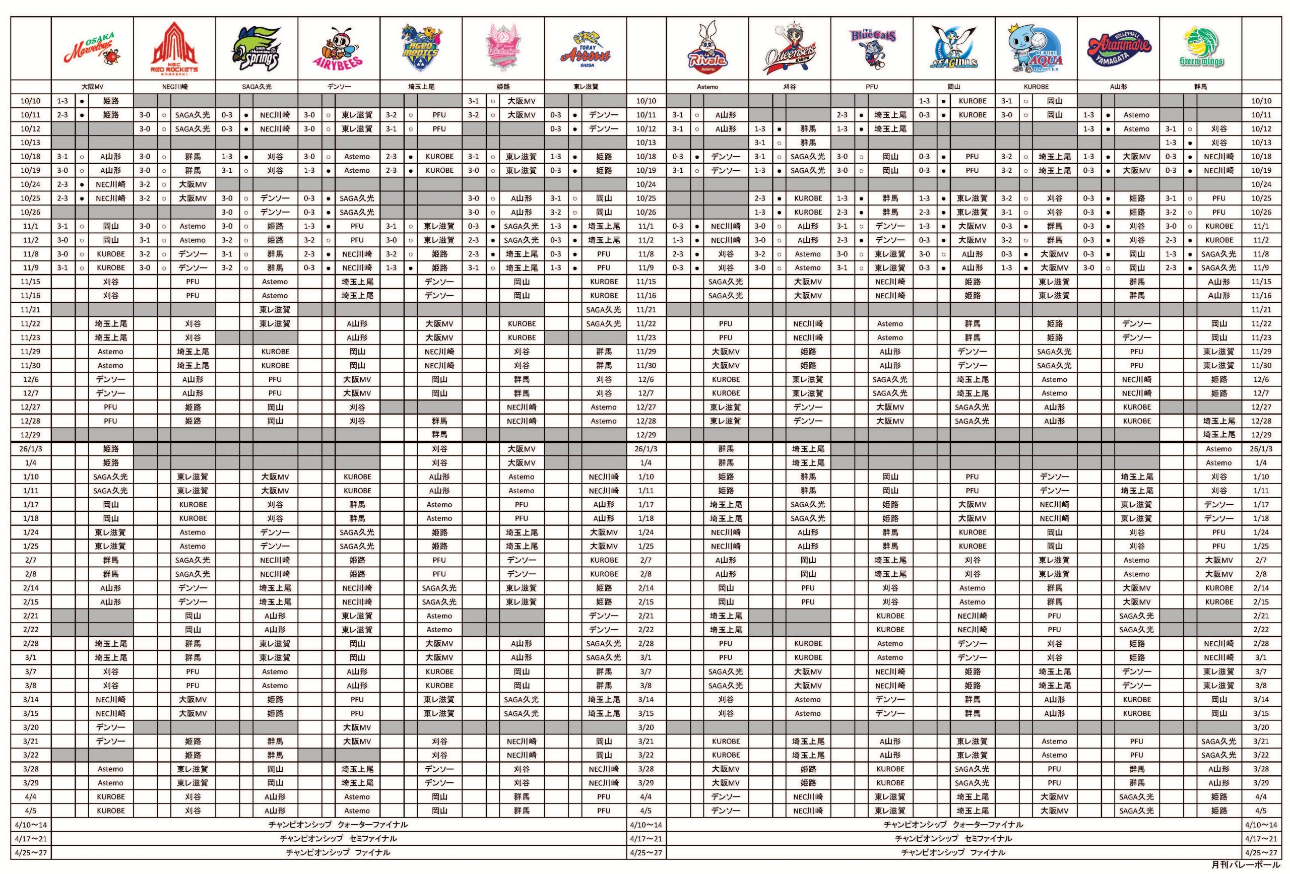 そのほかでは、NECレッドロケッツ川崎、SAGA久光スプリングス、大阪マーヴェラス、クインシーズ刈谷がいずれも連勝を飾り、埼玉上尾メディックスとヴィクトリーナ姫路は1勝1敗だった。
