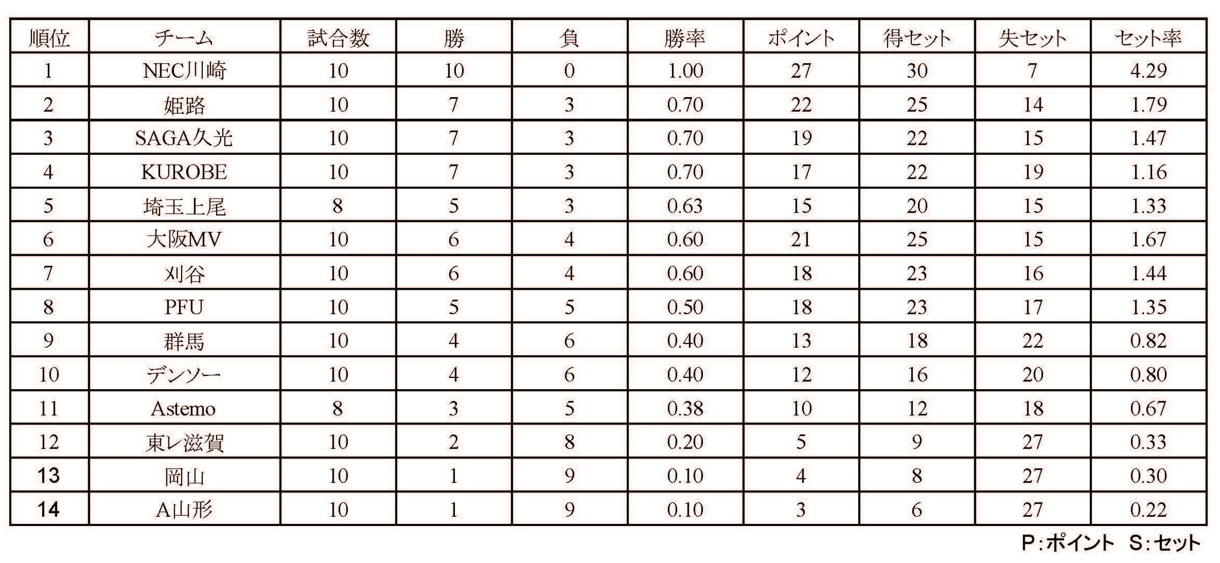 SV女子順位表(11月9日終了時点)