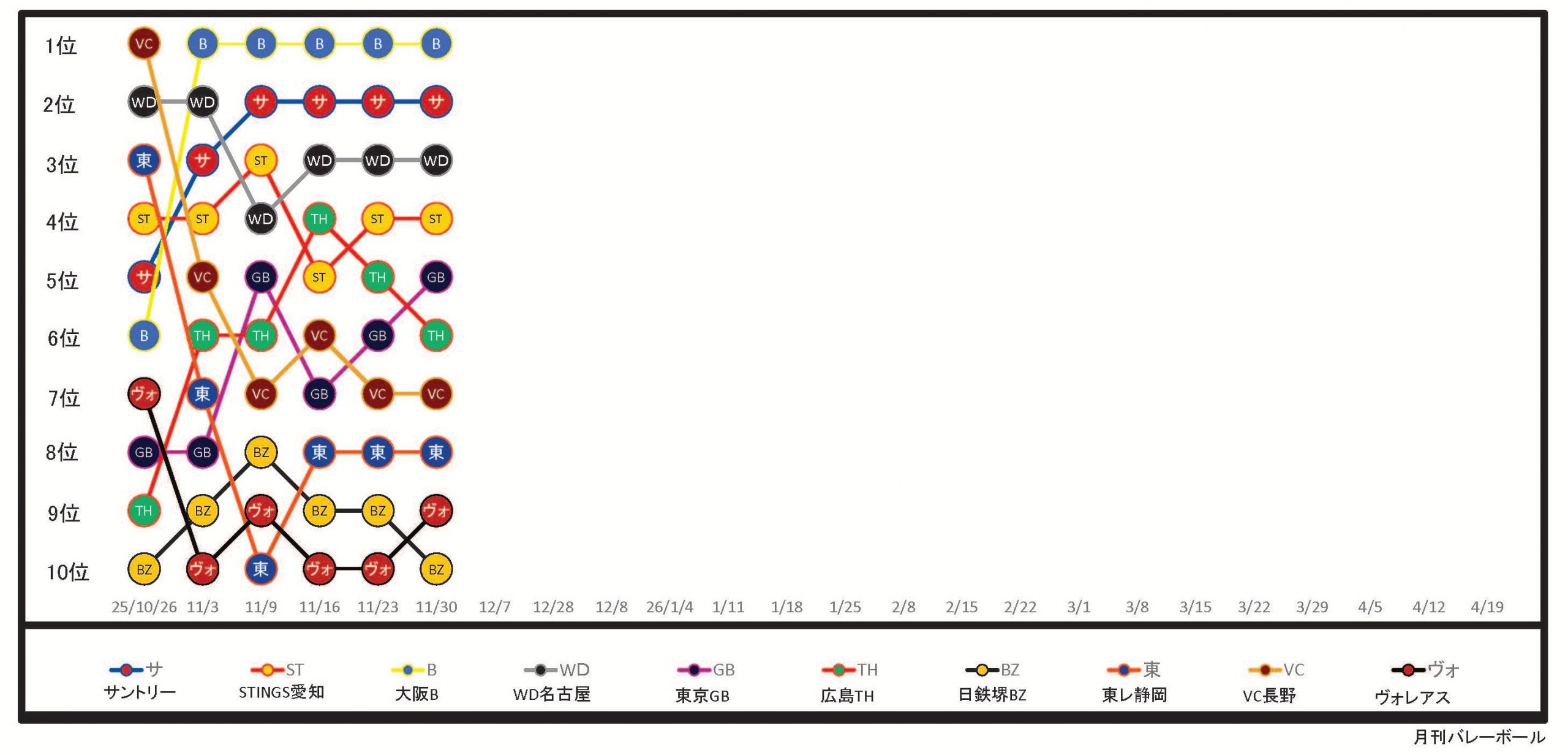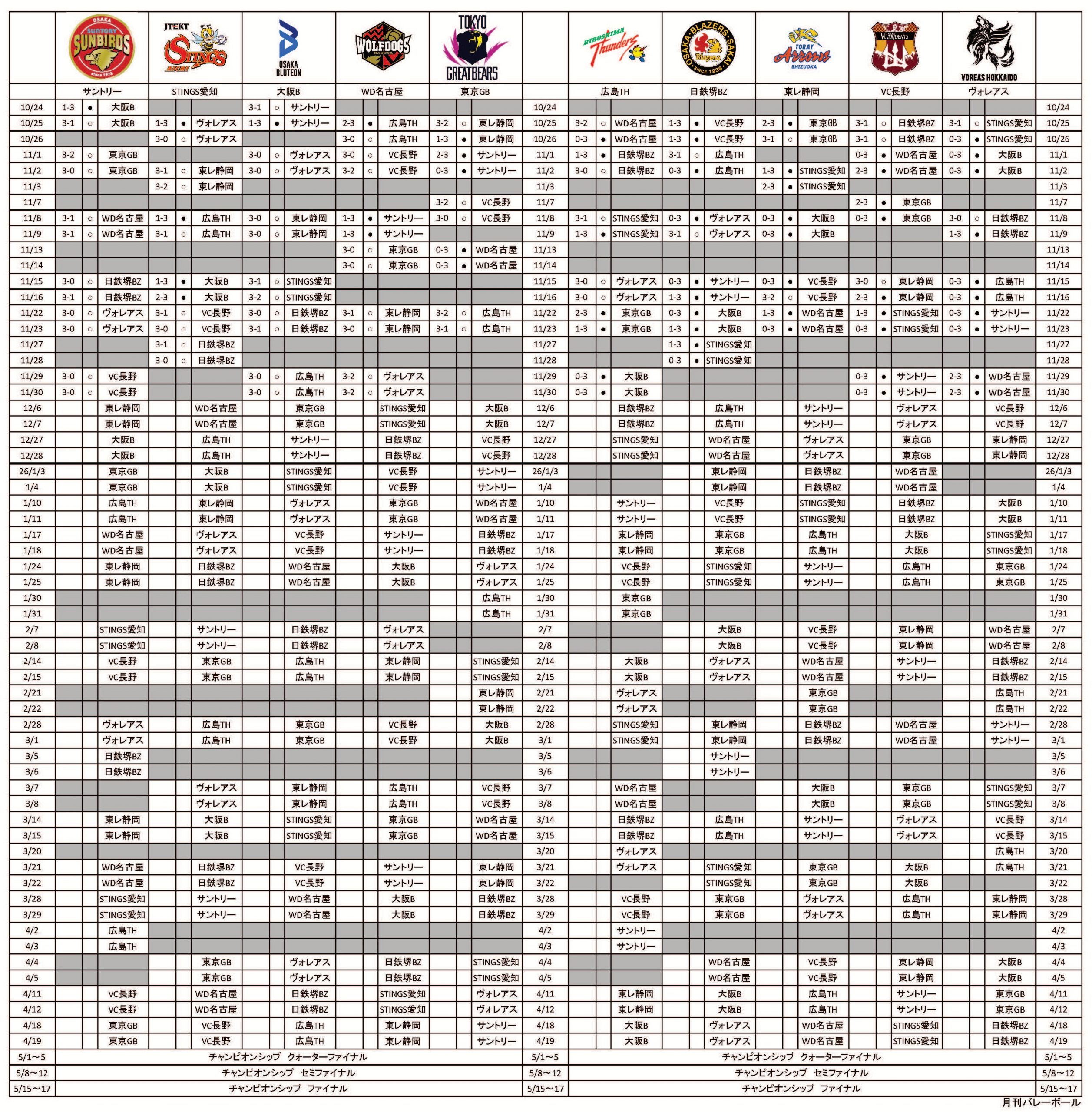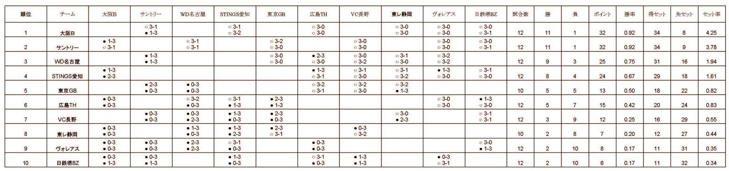 そのほか、サントリーサンバーズ大阪、大阪ブルテオン、ジェイテクトSTINGS愛知の上位勢が連勝を飾り、東京グレートベアーズと東レアローズ静岡は試合がなかった。