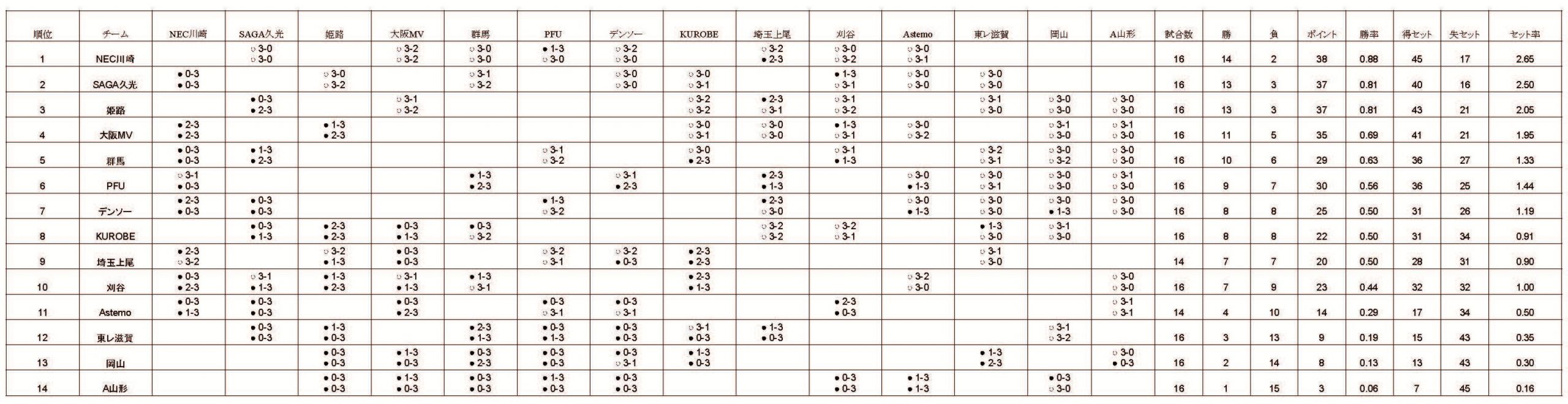 そのほかでは、ヴィクトリーナ姫路、SAGA久光スプリングス、大阪マーヴェラス、群馬グリーンウイングスと、PFUブルーキャッツ石川かほくが連勝を飾った。