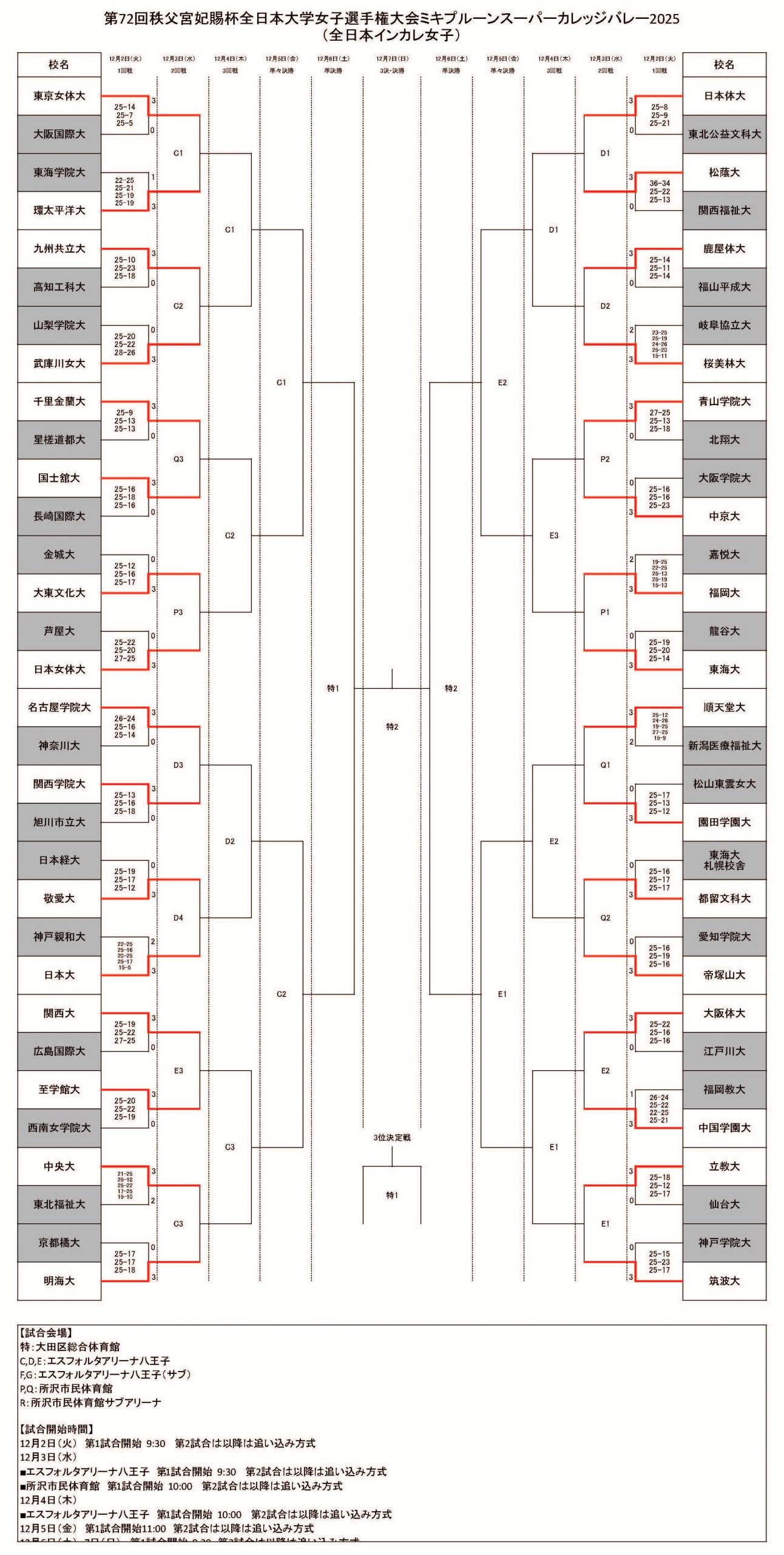 第72回秩父宮妃賜杯 全日本バレーボール大学女子選手権大会ミキプルーンスーパーカレッジバレー2025(全日本インカレ)が開幕。女子トーナメント1回戦の32試合が12月2日(火)にエスフォルタアリーナ八王子(東京)と所沢市民体育館(埼玉)で行われた。