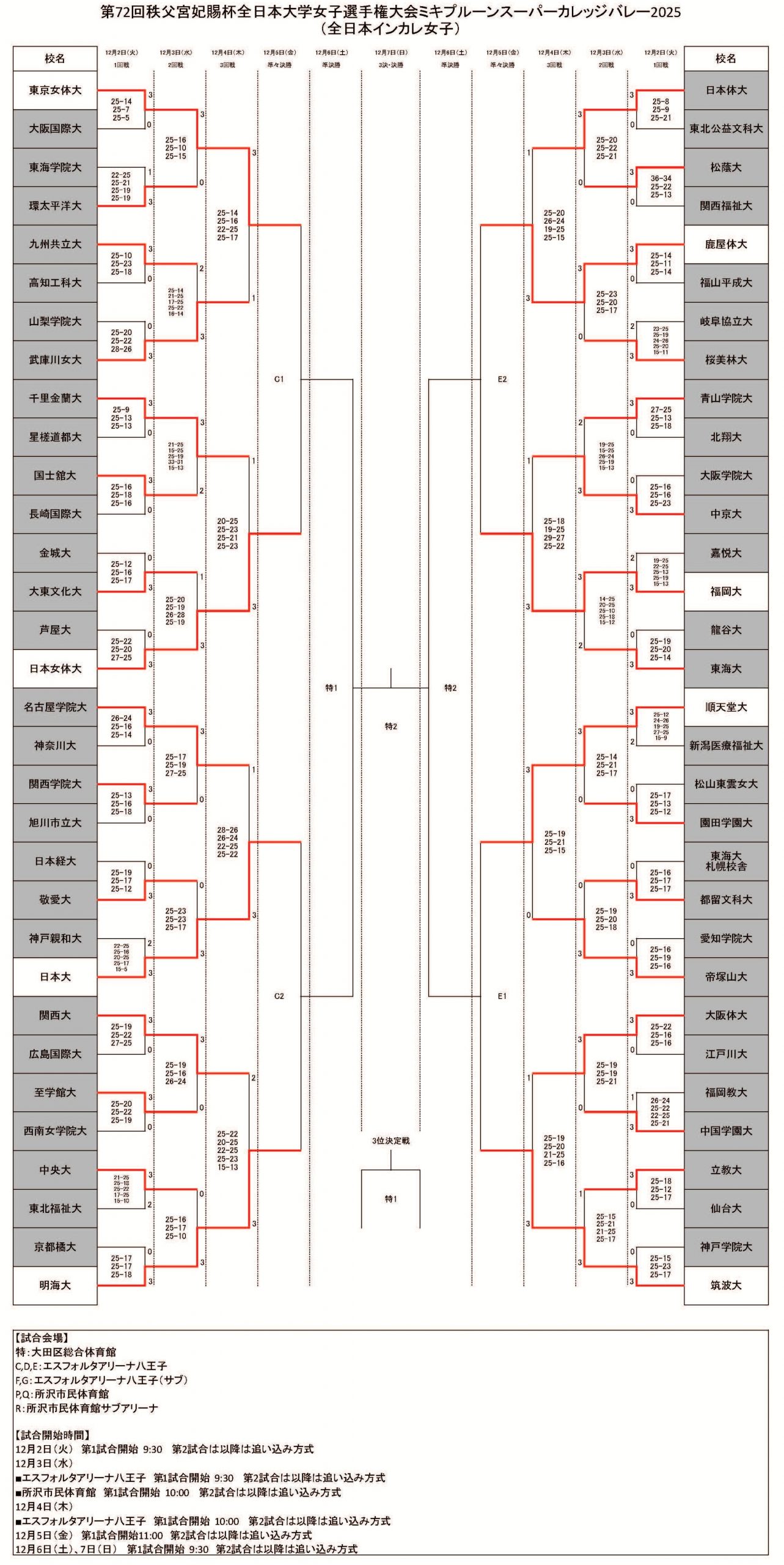 第72回秩父宮妃賜杯 全日本バレーボール大学女子選手権大会ミキプルーンスーパーカレッジバレー2025(全日本インカレ)の4日目、女子トーナメント3回戦の8試合が12月4日(木)にエスフォルタアリーナ八王子(東京)で行われた。