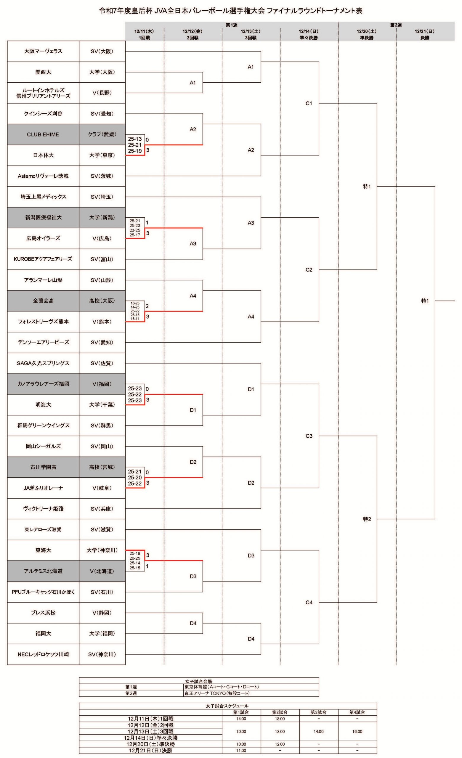 令和7年度天皇杯・皇后杯 JVA全日本バレーボール選手権大会ファイナルラウンドが12月11日(木)に開幕。男女トーナメント1回戦の計7試合(男子1試合、女子6試合)が東京体育館(東京都)で行われた。