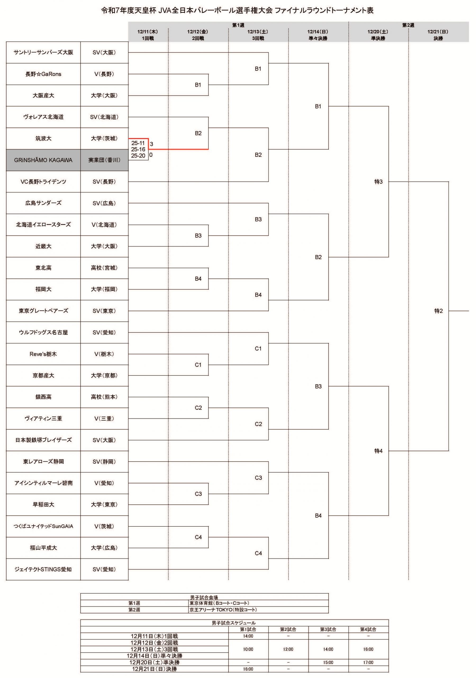 男子の1回戦は1試合のみ行われ、東日本インカレ王者の筑波大がGRiNSHĀMO KAGAWAにストレート勝ちを収め、2回戦へと勝ち進んだ。