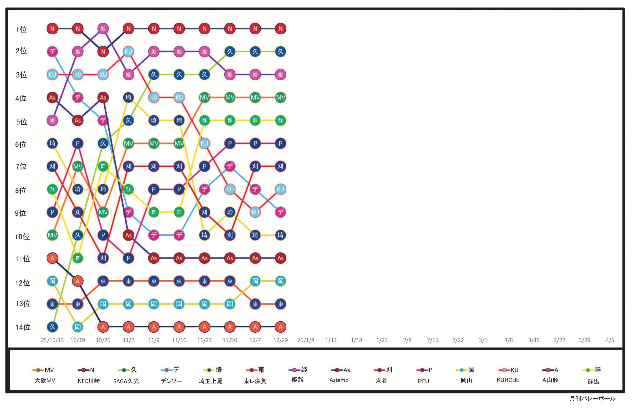 バレーボールの国内最高峰リーグ、2025-26大同生命SV.LEAGUE WOMEN(SV女子)は12月27日(土)から29日(月)の3日間で14試合が行われ、年内の日程を終了した。