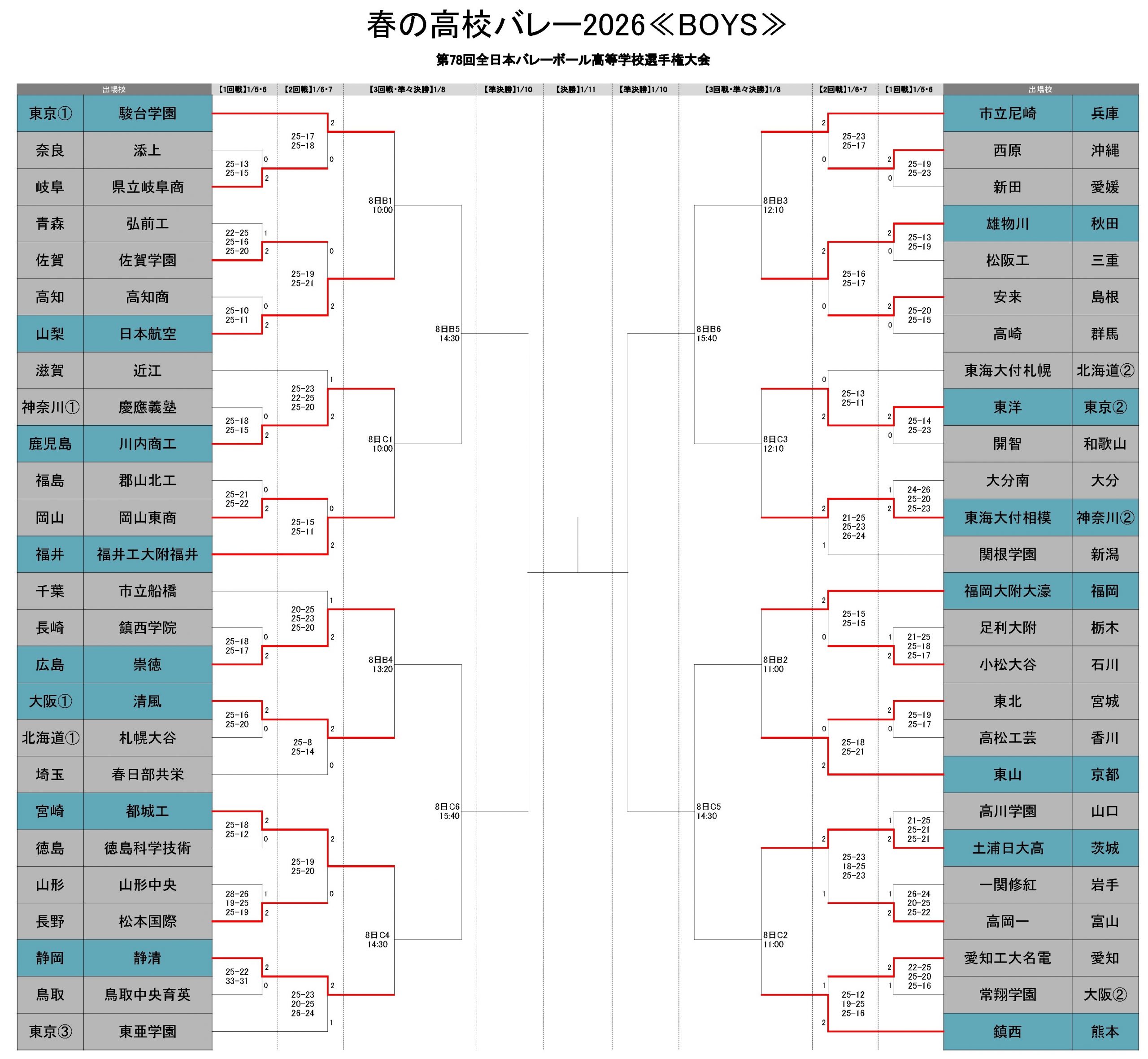 JVA 第78回全日本高等学校選手権大会(春の高校バレー2026)男子トーナメント表