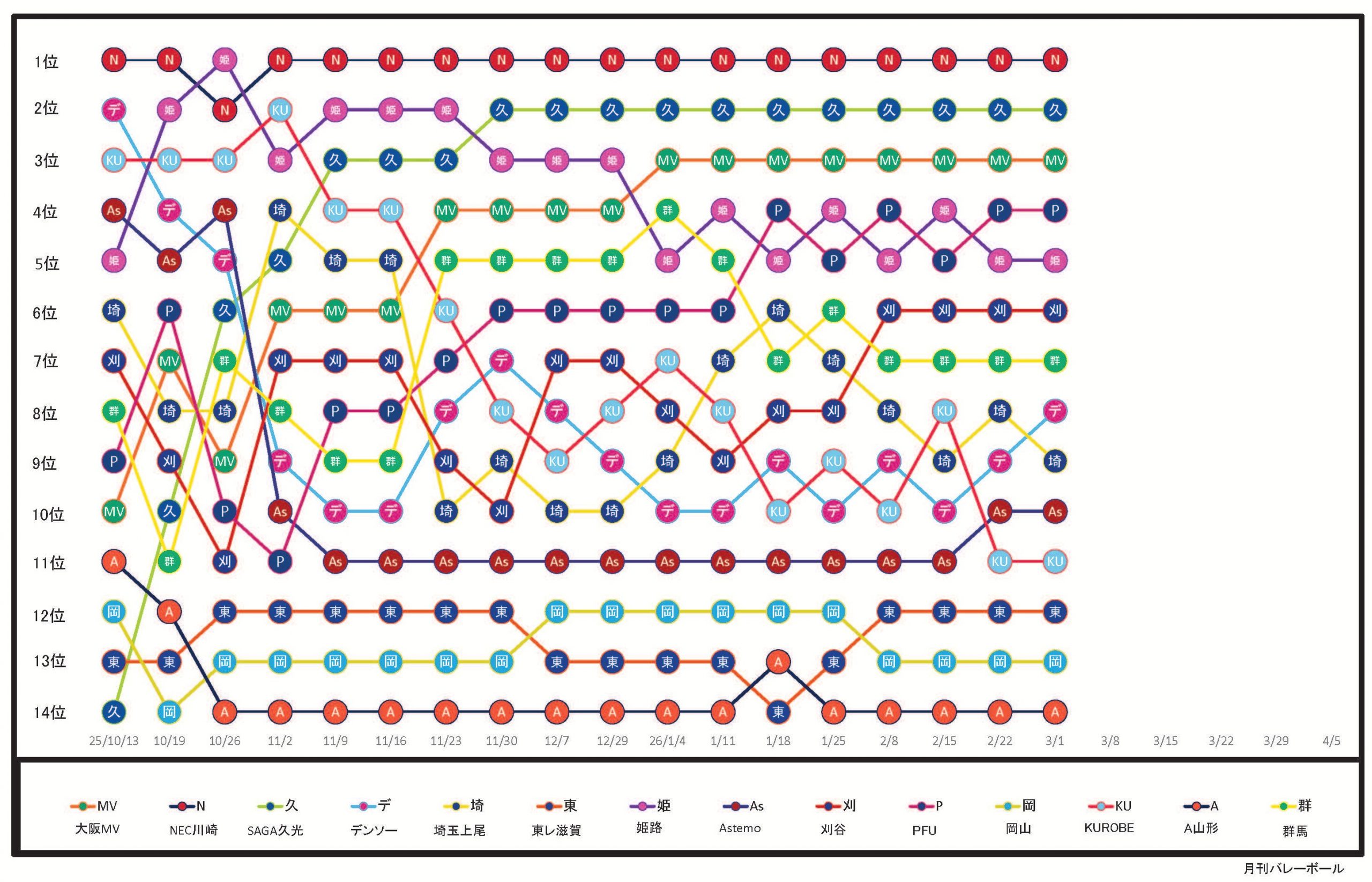 SV女子順位推移表(3月1日終了時点)