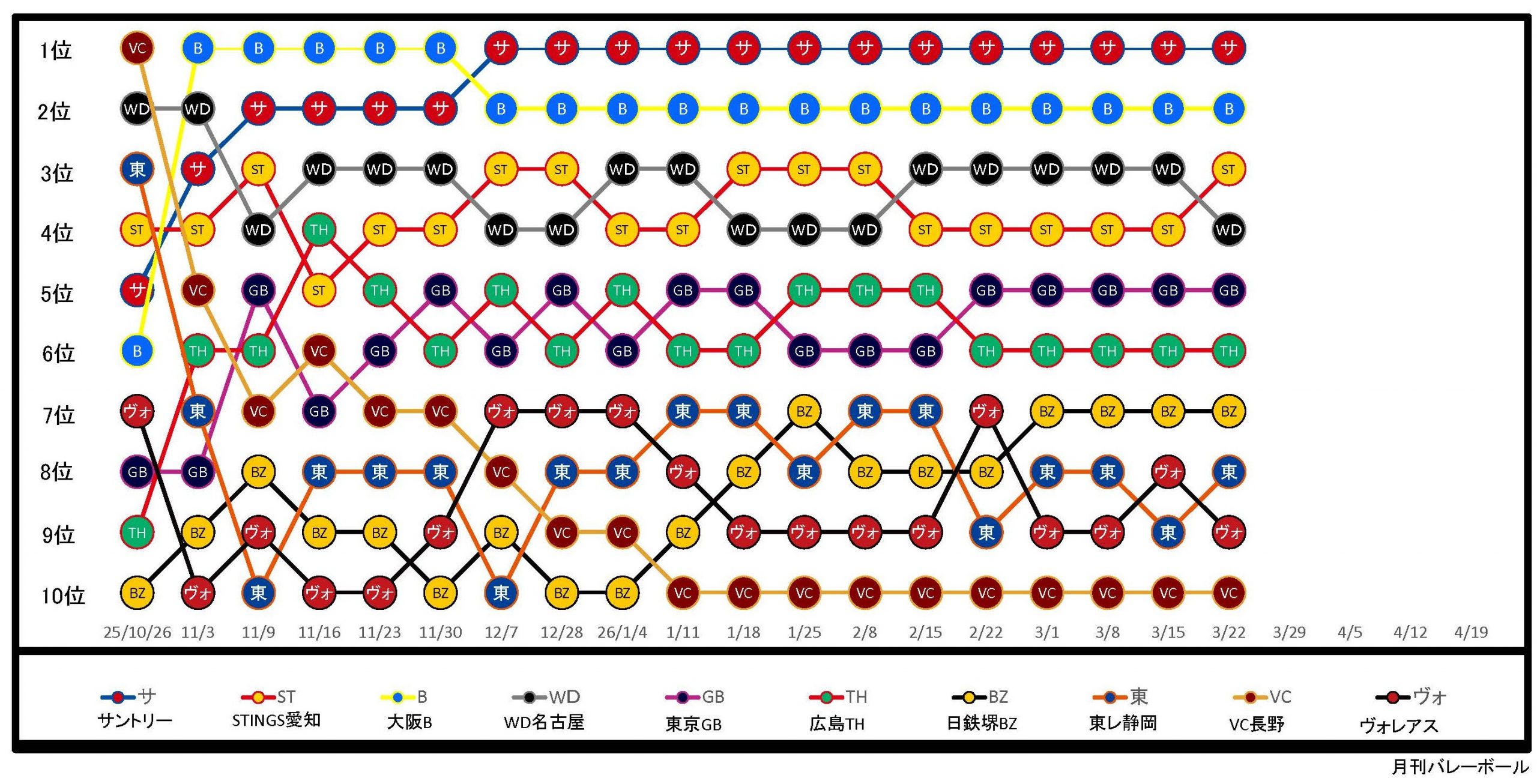【図】連勝連敗がひと目で分かるSV男子結果一覧(3月22日終了時点)