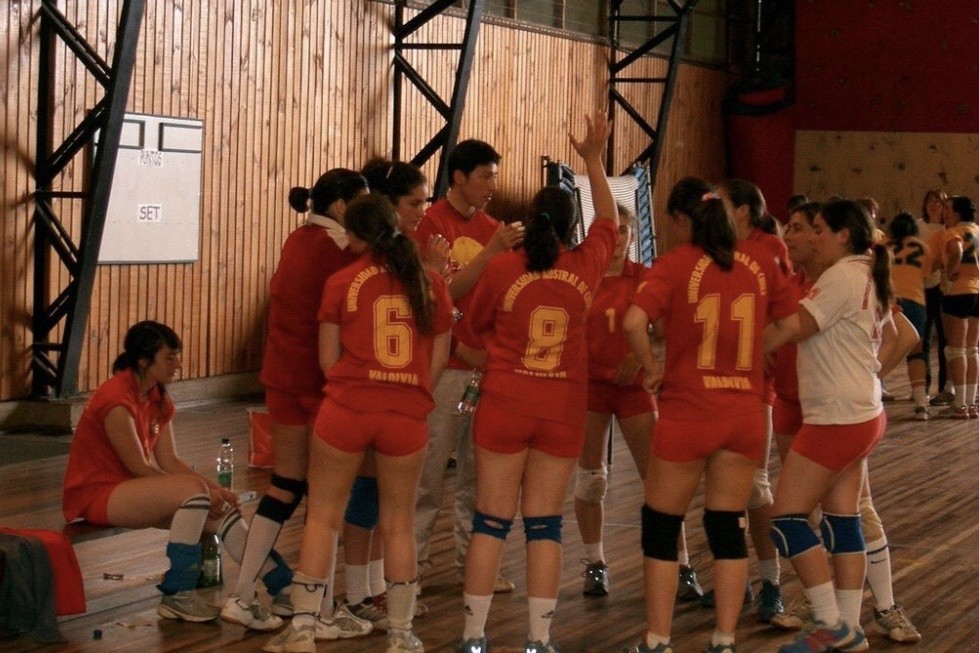 UNISUR(※)のタイムアウトで話す三枝さん(写真中央/2006年5月頃) ※チリ南部の主要大学によって構成されるスポーツリーグ