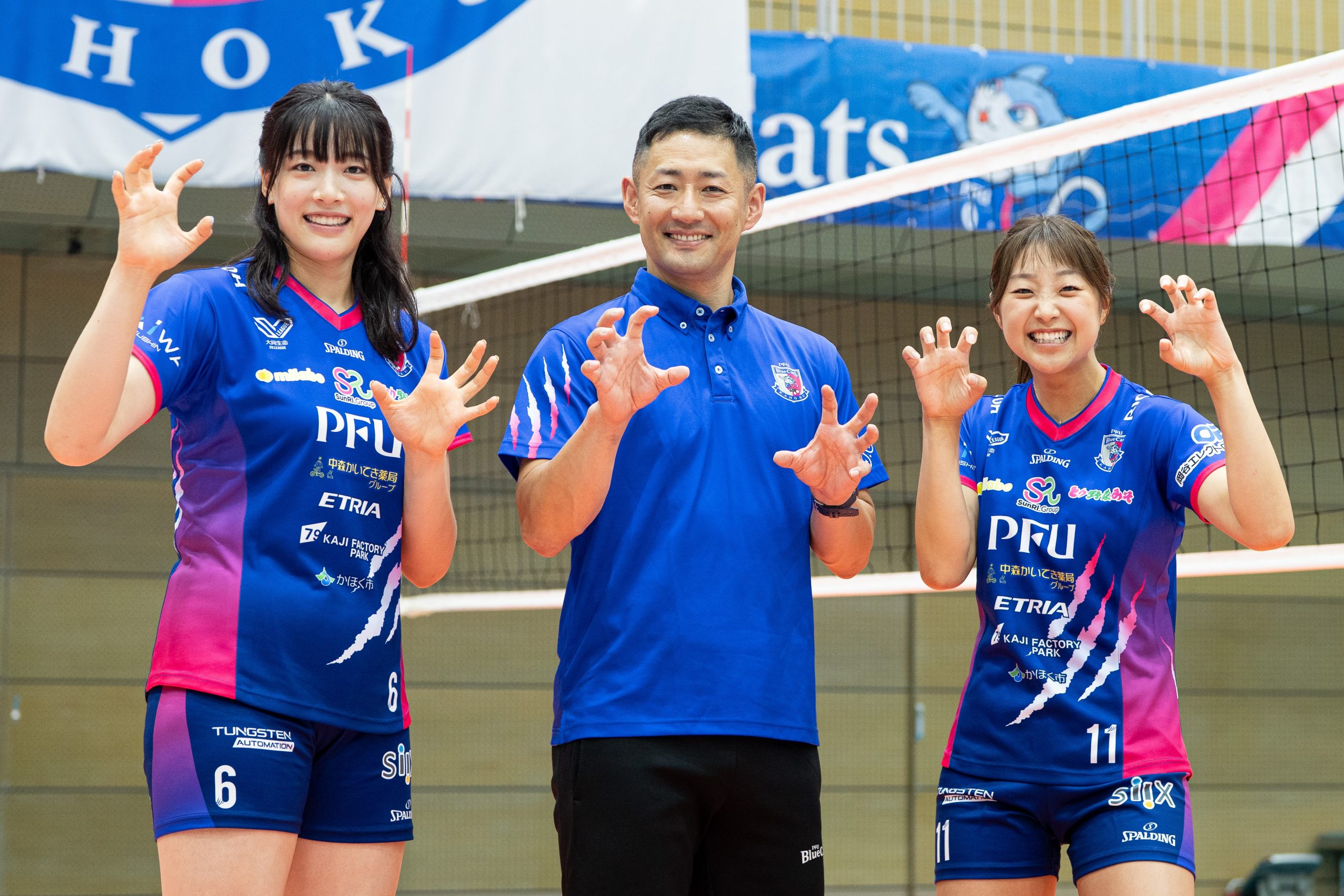 左から細沼綾主将、馬場大拓監督、松井珠己選手(PFUブルーキャッツ石川かほく)