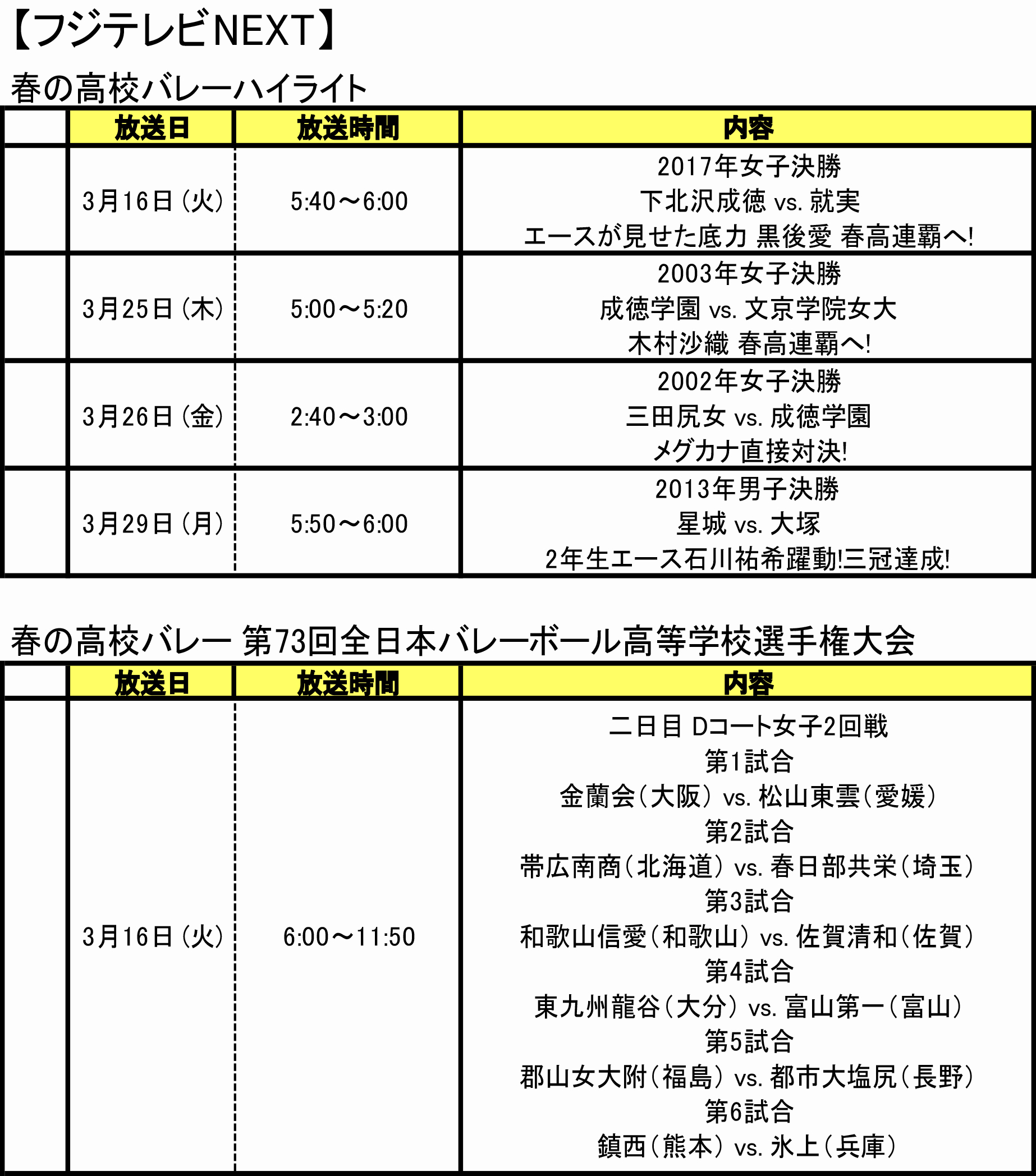 バレーボールテレビ番組情報(3/16〜31放送予定分)