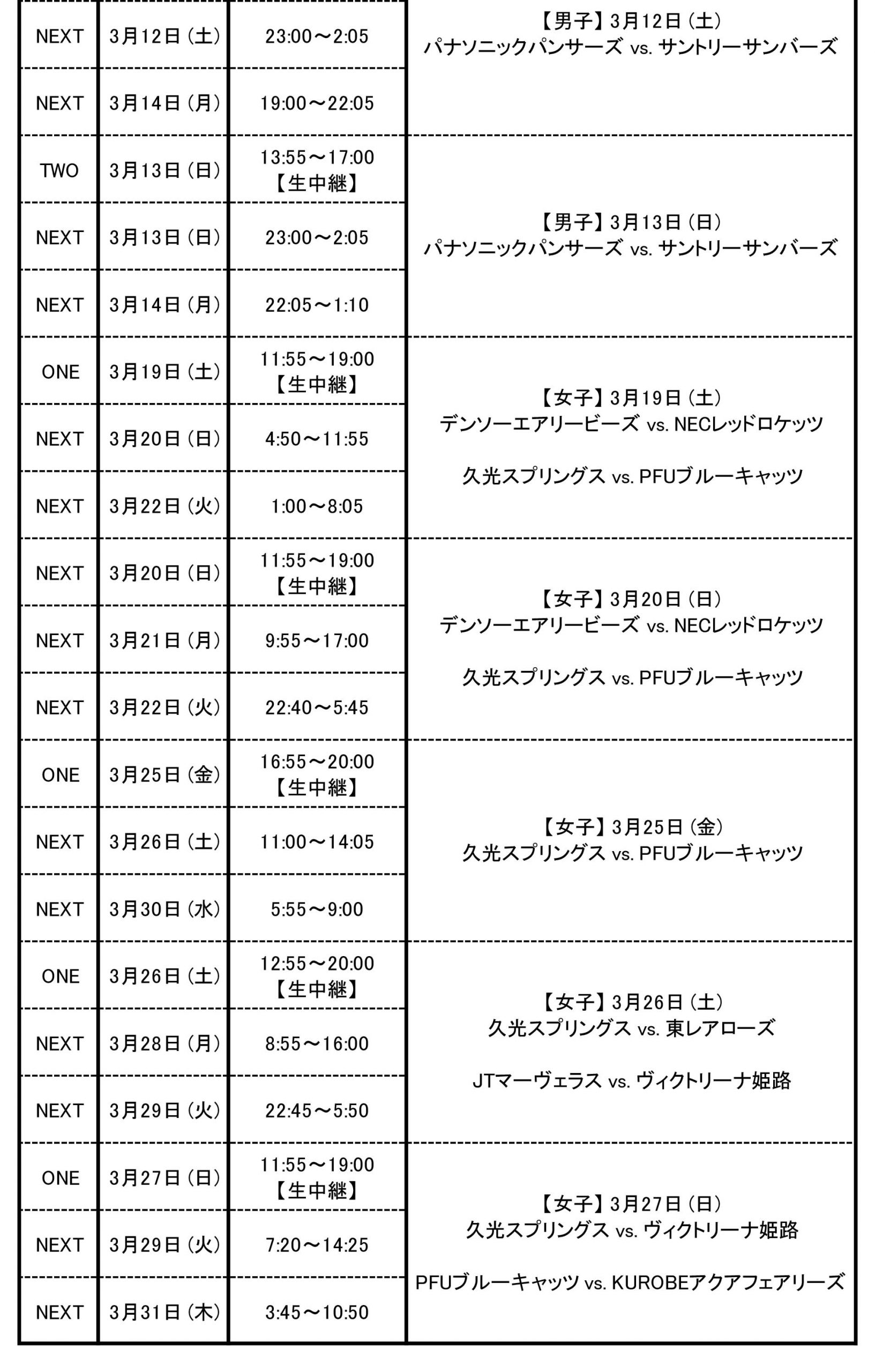 【フジテレビ】 春の高校バレー 第74回全日本バレーボール高等学校選手権大会 放送日 放送時間 内容 NEXT 3月16日 (水) 6:00~12:00 “男子準決勝 第1試合 鎮西(熊本) vs. 日南振徳(宮崎) 第2試合 日本航空(山梨) vs. 雄物川(秋田) 女子準決勝 第3試合 就実(岡山) vs. 金蘭会(大阪) 第4試合 古川学園(宮城) vs. 下北沢成徳(東京)” NEXT 3月17日 (木) 6:00~10:20 “男子決勝 日本航空(山梨) vs. 鎮西(熊本) 女子決勝 就実(岡山) vs. 古川学園(宮城)” バレーボール 2021-22Vリーグ DIVISION 1 放送日 放送時間 内容 ONE 3月5日 (土) “13:55~17:00 【生中継】” “【男子】 3月5日 (土) パナソニックパンサーズ vs. 東レアローズ” NEXT 3月5日 (土) 19:30~22:35 NEXT 3月7日 (月) 19:00~22:05 ONE 3月6日 (日) “13:55~17:00 【生中継】” “【男子】 3月6日 (日) パナソニックパンサーズ vs. 東レアローズ” NEXT 3月6日 (日) 23:00~2:05 NEXT 3月9日 (水) 2:00~5:05 ONE 3月9日 (水) “17:55~21:00 【生中継】” “【女子】 3月9日 (水) 埼玉上尾メディックス vs. NECレッドロケッツ” TWO 3月12日 (土) “13:55~17:00 【生中継】” “【男子】 3月12日 (土) パナソニックパンサーズ vs. サントリーサンバーズ” NEXT 3月12日 (土) 23:00~2:05 NEXT 3月14日 (月) 19:00~22:05 TWO 3月13日 (日) “13:55~17:00 【生中継】” “【男子】 3月13日 (日) パナソニックパンサーズ vs. サントリーサンバーズ” NEXT 3月13日 (日) 23:00~2:05 NEXT 3月14日 (月) 22:05~1:10 ONE 3月19日 (土) “11:55~19:00 【生中継】” “【女子】 3月19日 (土) デンソーエアリービーズ vs. NECレッドロケッツ 久光スプリングス vs. PFUブルーキャッツ” NEXT 3月20日 (日) 4:50~11:55 NEXT 3月22日 (火) 1:00~8:05 NEXT 3月20日 (日) “11:55~19:00 【生中継】” “【女子】 3月20日 (日) デンソーエアリービーズ vs. NECレッドロケッツ 久光スプリングス vs. PFUブルーキャッツ” NEXT 3月21日 (月) 9:55~17:00 NEXT 3月22日 (火) 22:40~5:45 ONE 3月25日 (金) “16:55~20:00 【生中継】” “【女子】 3月25日 (金) 久光スプリングス vs. PFUブルーキャッツ” ONE 3月26日 (土) “12:55~20:00 【生中継】” “【女子】 3月26日 (土) 久光スプリングス vs. 東レアローズ JTマーヴェラス vs. ヴィクトリーナ姫路” NEXT 3月28日 (月) 8:55~16:00 NEXT 3月29日 (火) 22:45~5:50 ONE 3月27日 (日) “11:55~19:00 【生中継】” “【女子】 3月27日 (日) 久光スプリングス vs. ヴィクトリーナ姫路 PFUブルーキャッツ vs. KUROBEアクアフェアリーズ” NEXT 3月29日 (火) 7:20~14:25 NEXT 3月31日 (木) 3:45~10:50 春の高校バレー ハイライト 放送日 放送時間 内容 NEXT 3月7日 (月) 7:30~8:00 “2019年女子決勝 金蘭会 vs. 東九州龍谷 フルセットの大熱戦!” 3月9日 (水) 5:20~5:30 “2014年女子決勝 九州文化学園 vs. 東九州龍谷 歴史的な大逆転劇!” 3月14日 (月) 2:05~2:20 “2010年男子決勝 東洋 vs. 鎮西 “”プリンス””柳田将洋が躍動!” 3月20日 (日) 6:30~6:50 “2017年女子決勝 下北沢成徳 vs. 就実 エースが見せた底力 黒後愛 春高連覇へ!” 3月23日 (水) 5:45~6:00 “2019年男子決勝 洛南 vs. 清風 前年のリベンジへ!洛南エース大塚が躍動!” 3月27日 (日) 10:20~10:30 “2013年男子決勝 星城 vs. 大塚 2年生エース石川祐希躍動!三冠達成!” 10:30~11:00 “2020年女子決勝 古川学園 vs. 東九州龍谷 3度目の正直!東龍が8年ぶりV” 第21回アジア男子バレーボール選手権大会 放送日 放送時間 内容 NEXT 3月1日 (火) 10:45~12:55 “予選グループリーグ戦 A組 日本 vs. カタール” 12:55~15:15 “予選グループリーグ戦 A組 日本 vs. バーレーン” 15:15~17:00 “予選グループリーグ戦 A組 日本 vs. インド” 3月2日 (水) 7:40〜10:00 “予選グループリーグ戦 A組 日本 vs. 中国” 10:00〜12:10 “順位決定予備戦 日本 vs. オーストラリア” 12:10〜14:50 “準決勝 日本 vs. チャイニーズタイペイ” 14:50~17:50 “決勝 日本 vs. イラン”